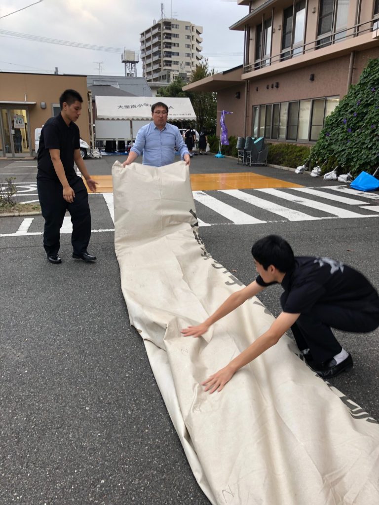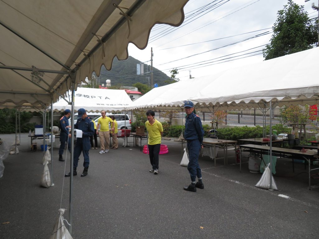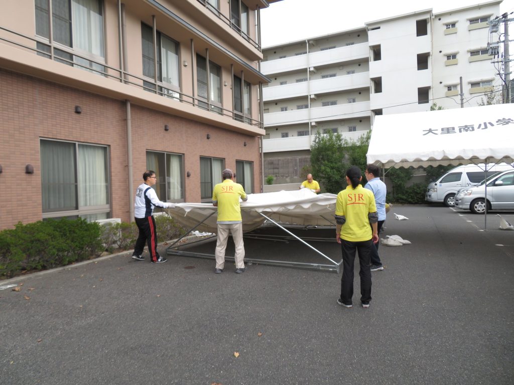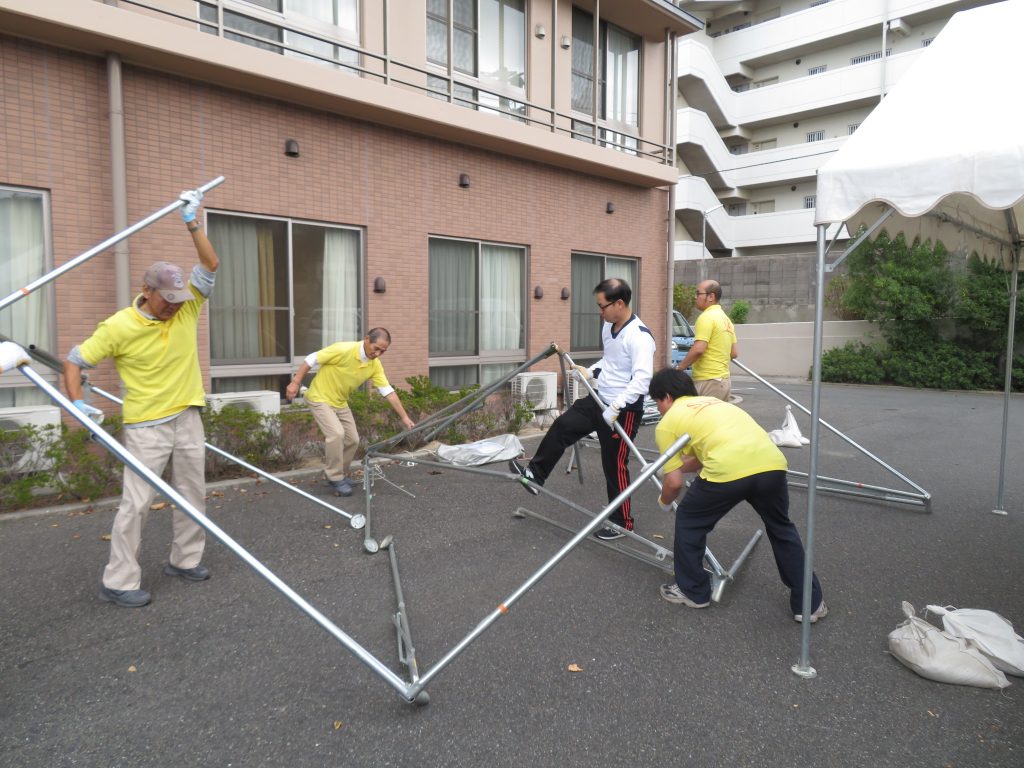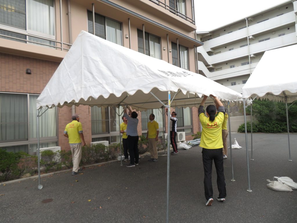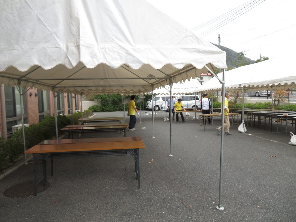 テントは7張、大里南小学校からお借りしました。いつも有難うございます。男性中心で1時間以上かけて張ります。早朝なので元気いっぱいです。