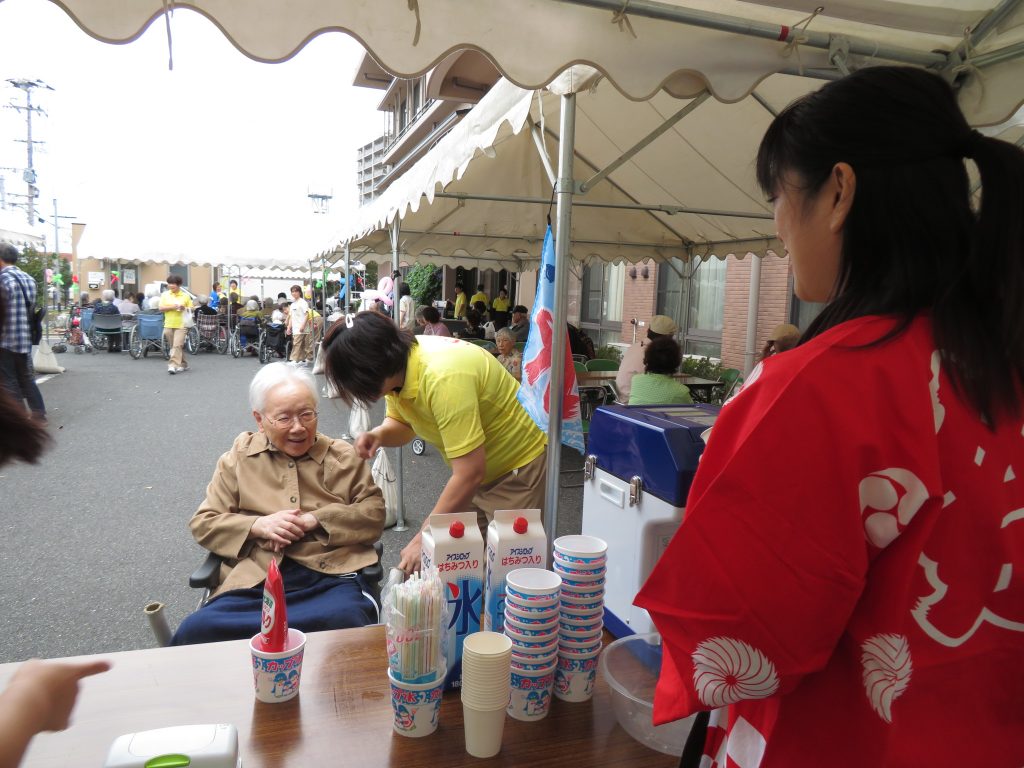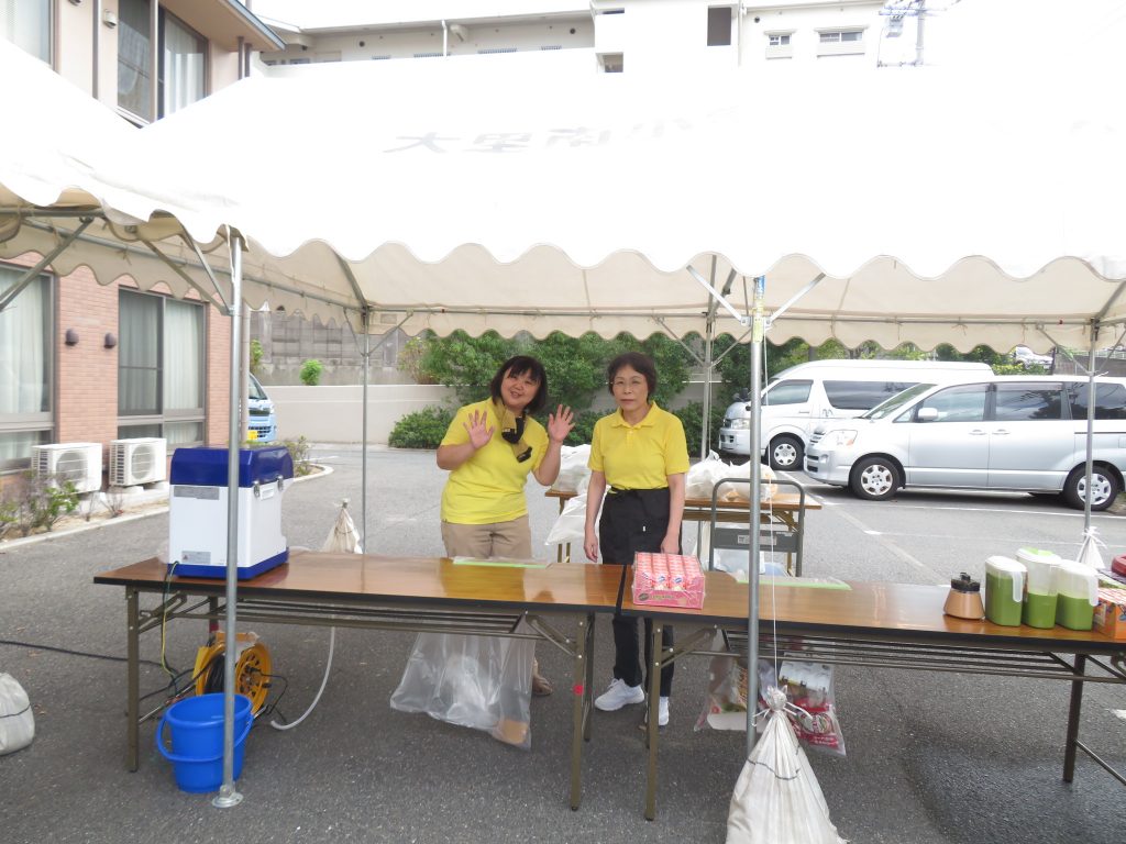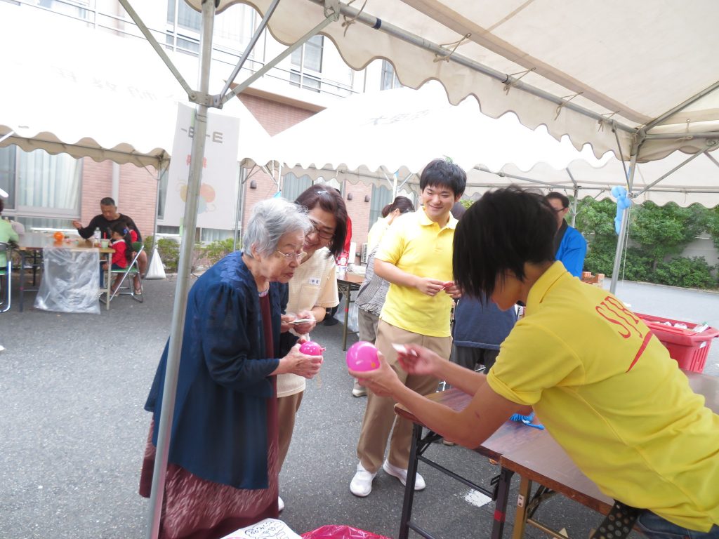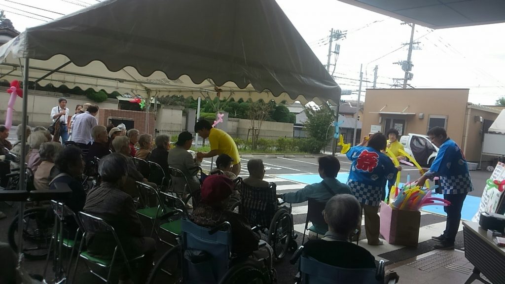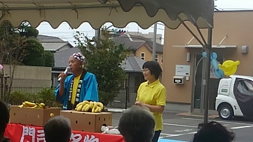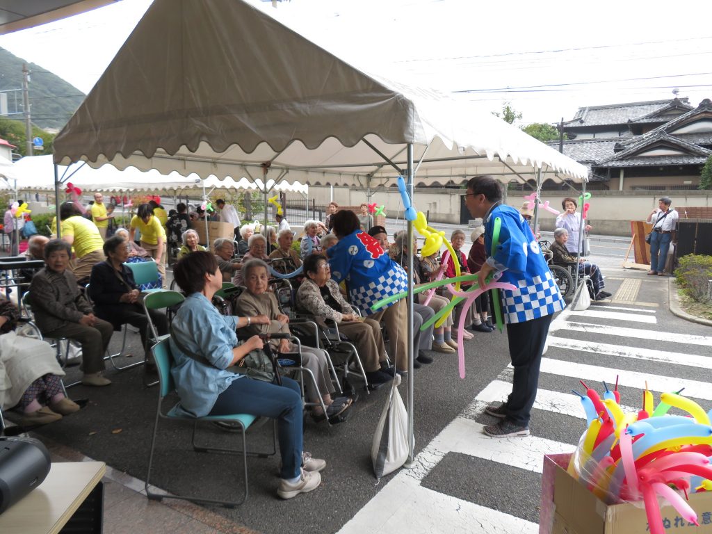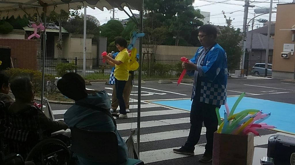 台風19号の進路によっては、開催は危ぶまれました。北九州市は、強風域にも入らず、「地域交流秋祭り」を決行致しました。右は総合司会者、左は広報担当で看板とチラシを作成した介護職員です。
