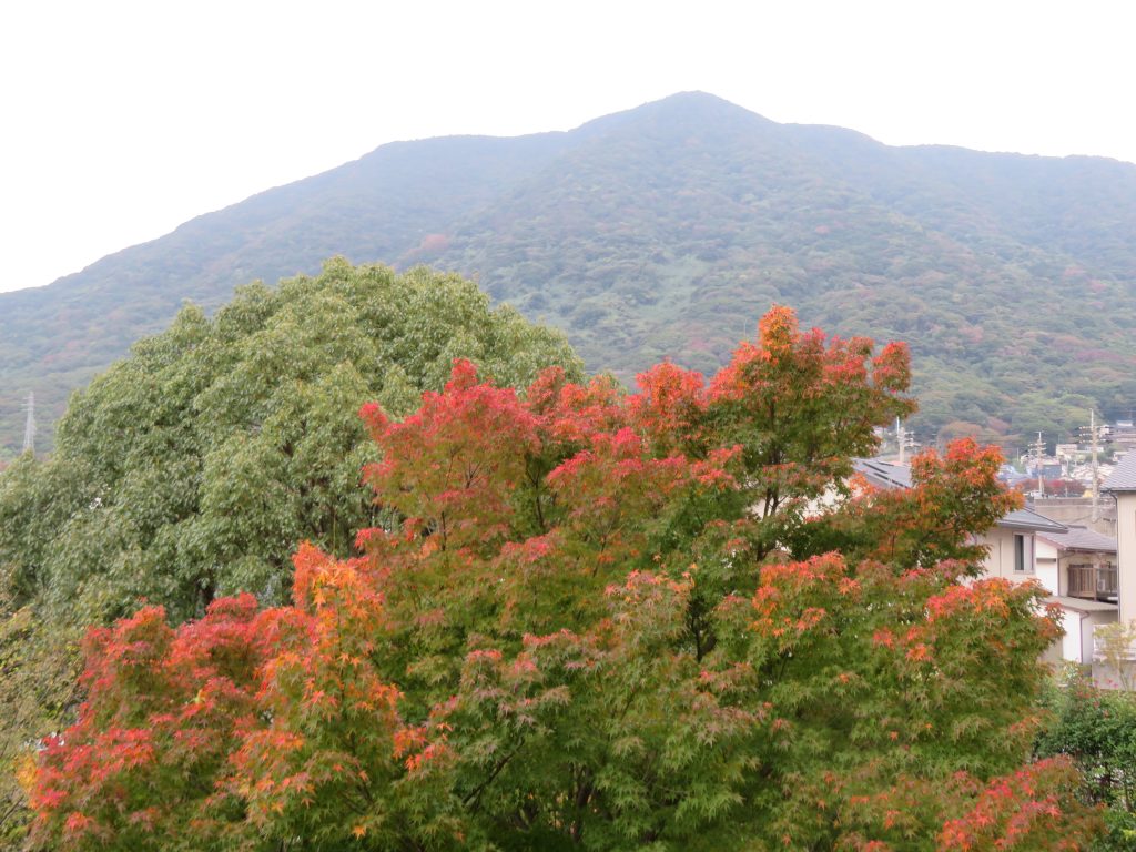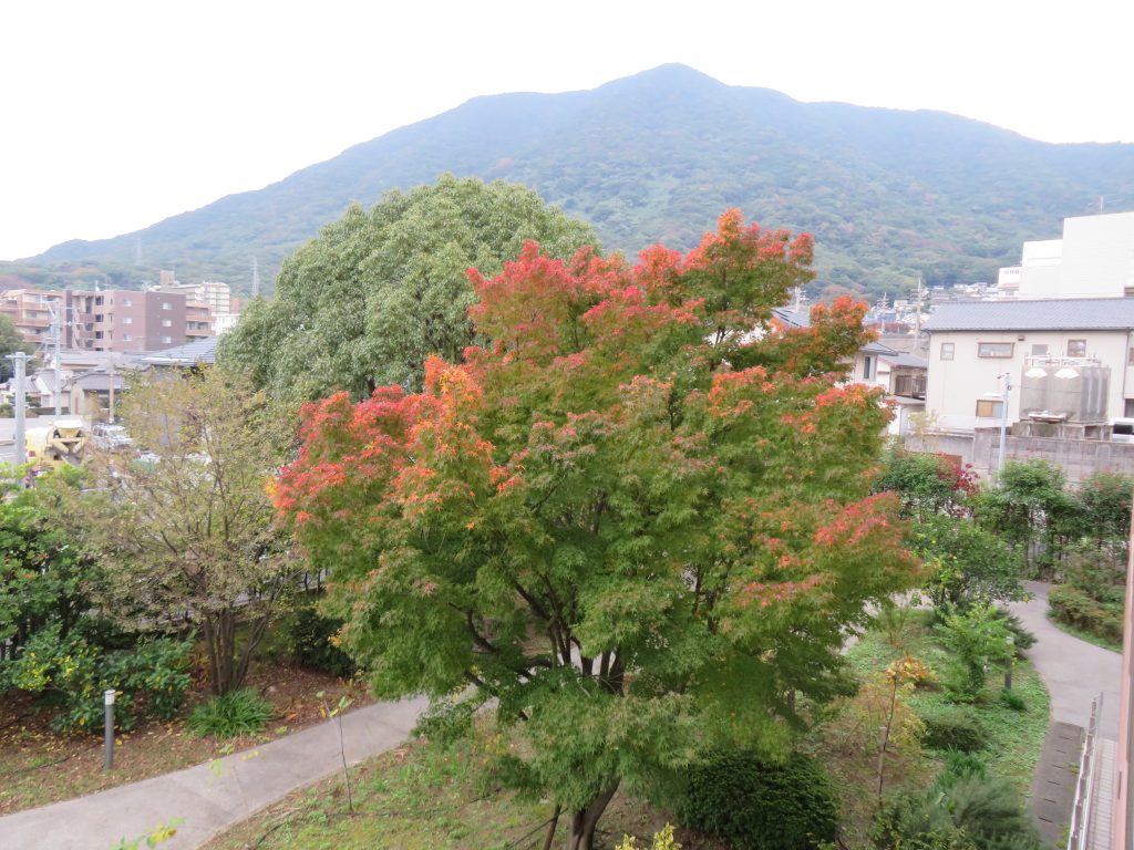 2階のバルコニーから園庭のヤマモミジと戸ノ上山がみえます
