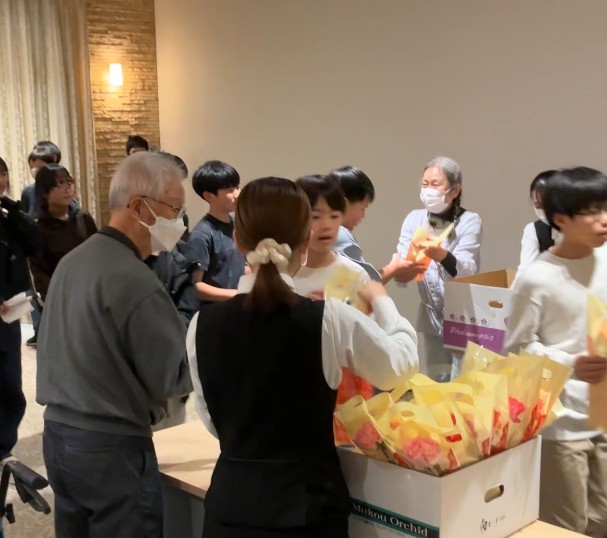 「素晴らしい合唱をありがとう」とお花を渡される入居者様に