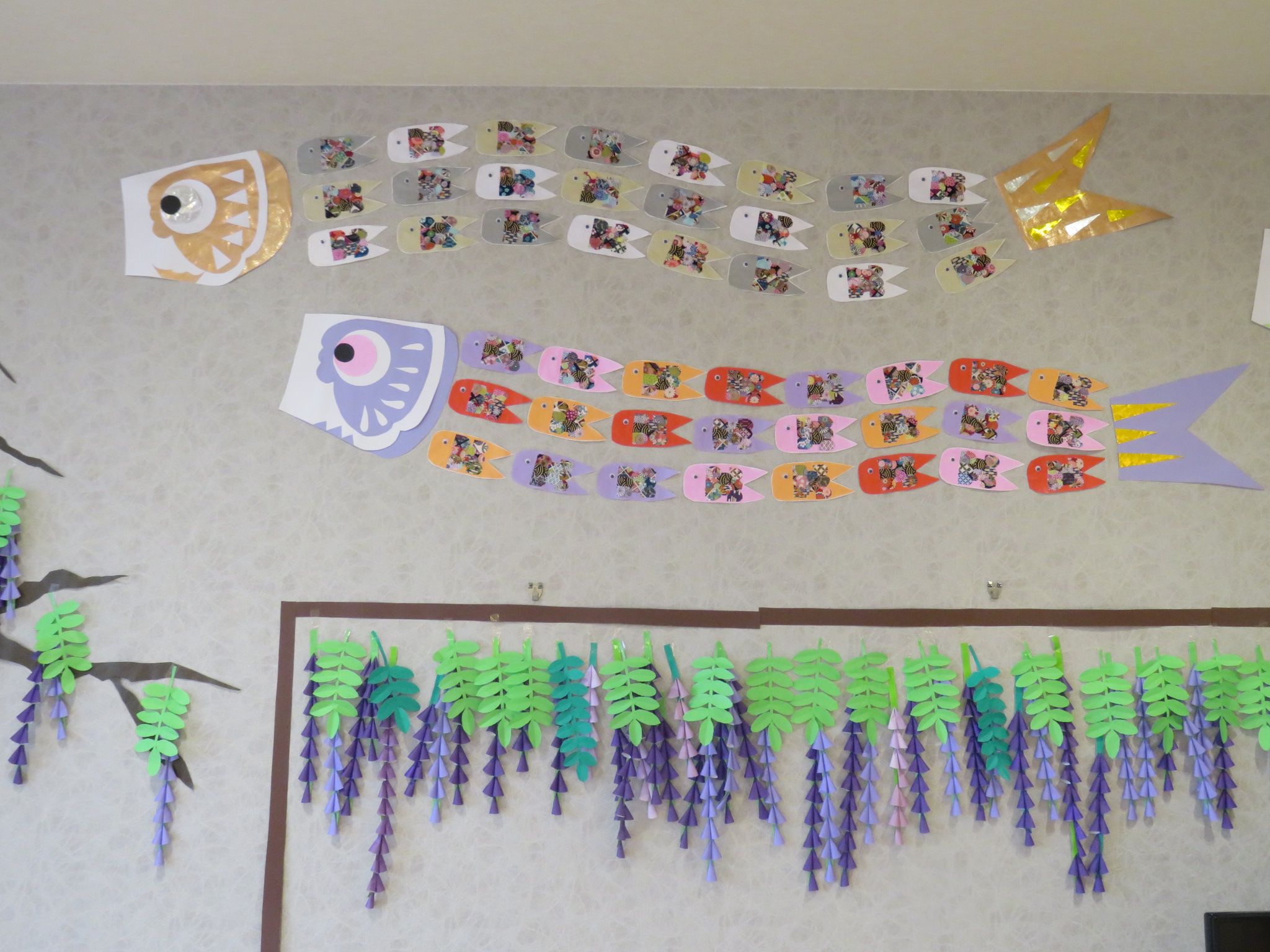 SJR大分では、手作りの鯉のぼりの飾りつけや、五月人形を飾り、入居者様に季節を感じていただきました。