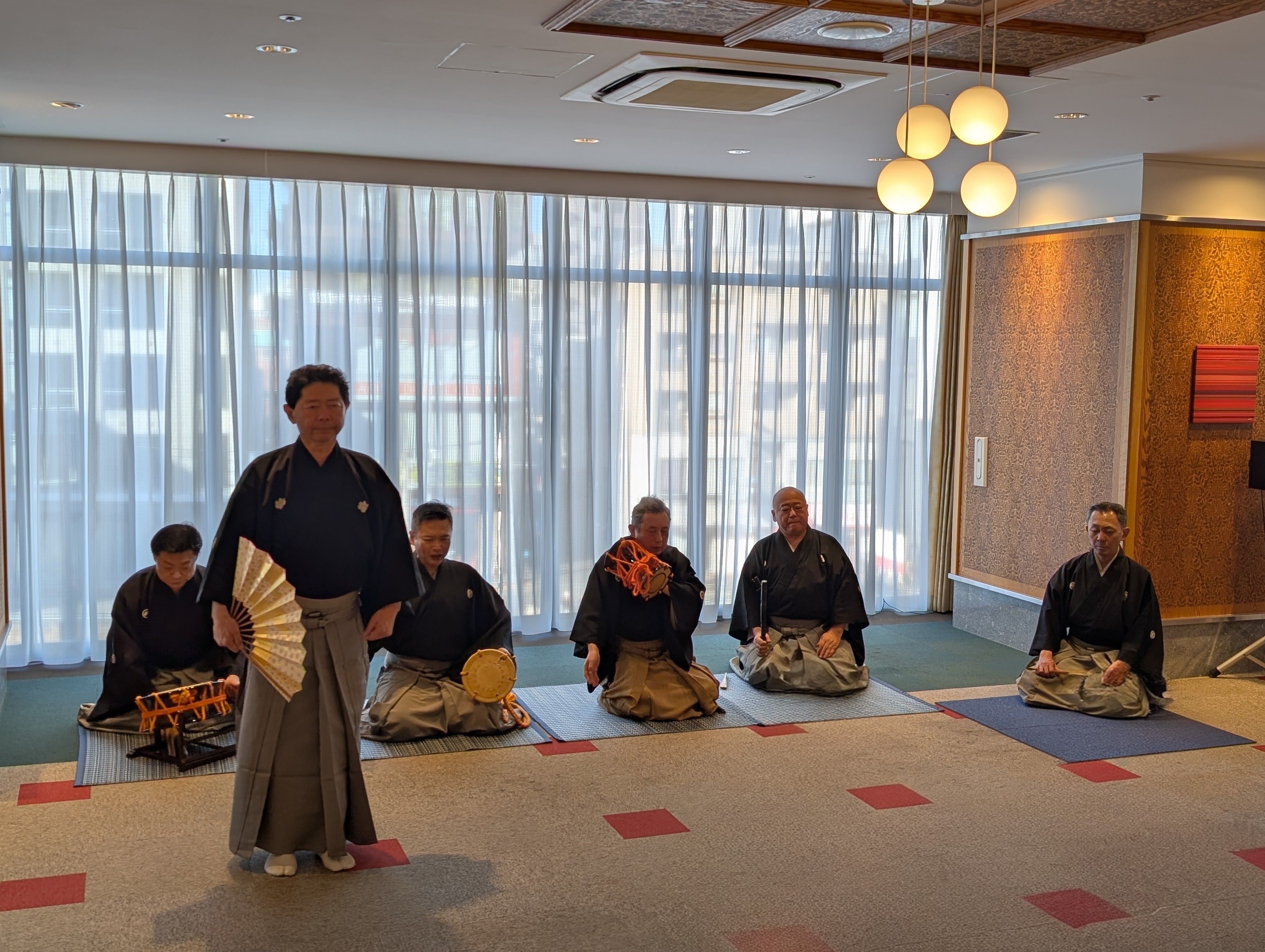 1月6日(火)、2026年最初のイベントとして「能の囃子の世界」を開催しました。この能イベントはSJR六本松の新春恒例イベントとして毎年開催しているものです。ご出演いただいたのは、中央区桜坂の老舗能舞台「森本能舞台」代表の森本哲郎様ほか各ご関係の皆さま、笛・相原和彦様、小鼓・飯冨章宏様、大鼓・白坂保行様、太鼓・田中達様、地謡・久保誠一郎様の皆さまにご協力いただき開催しました。