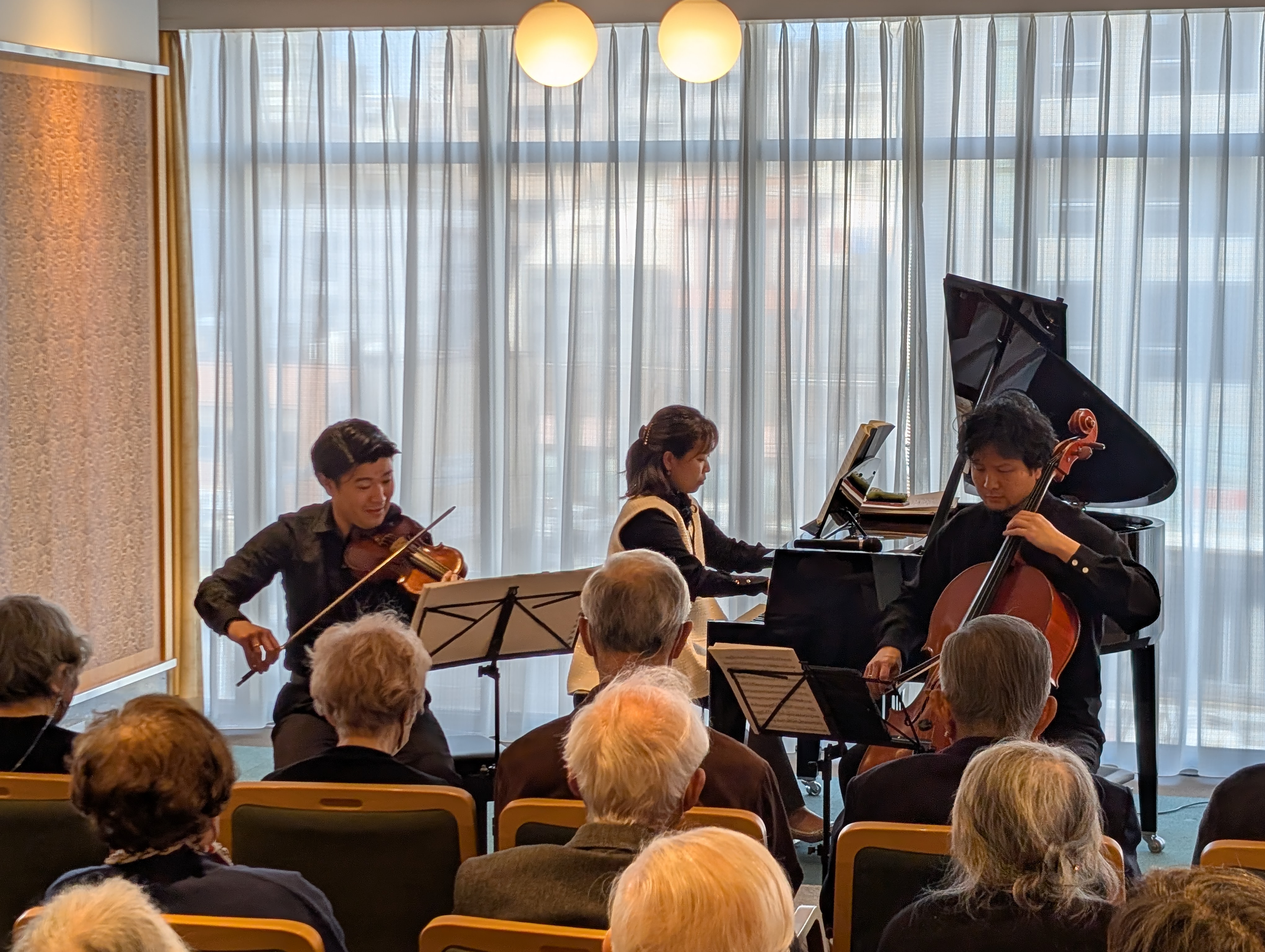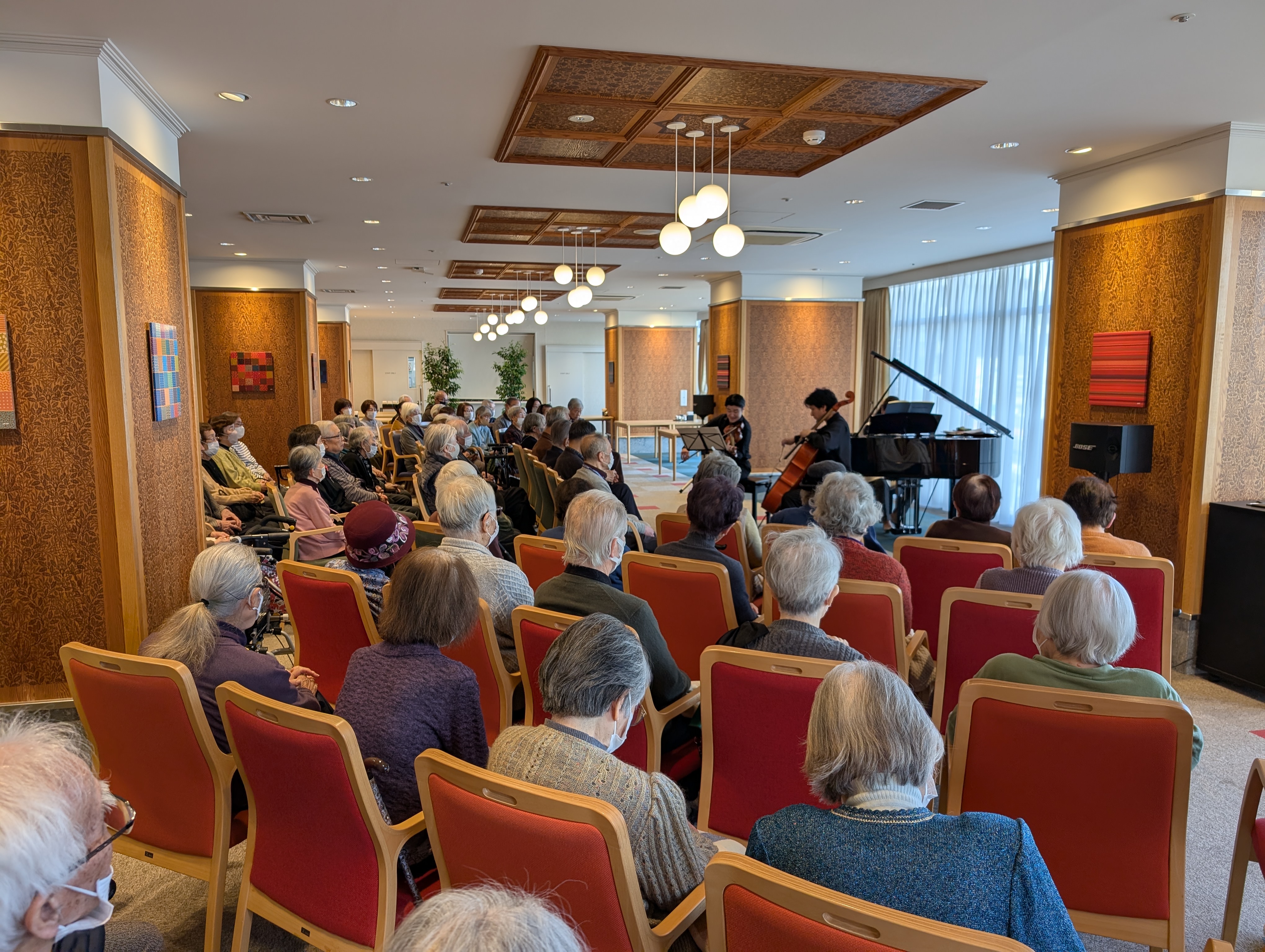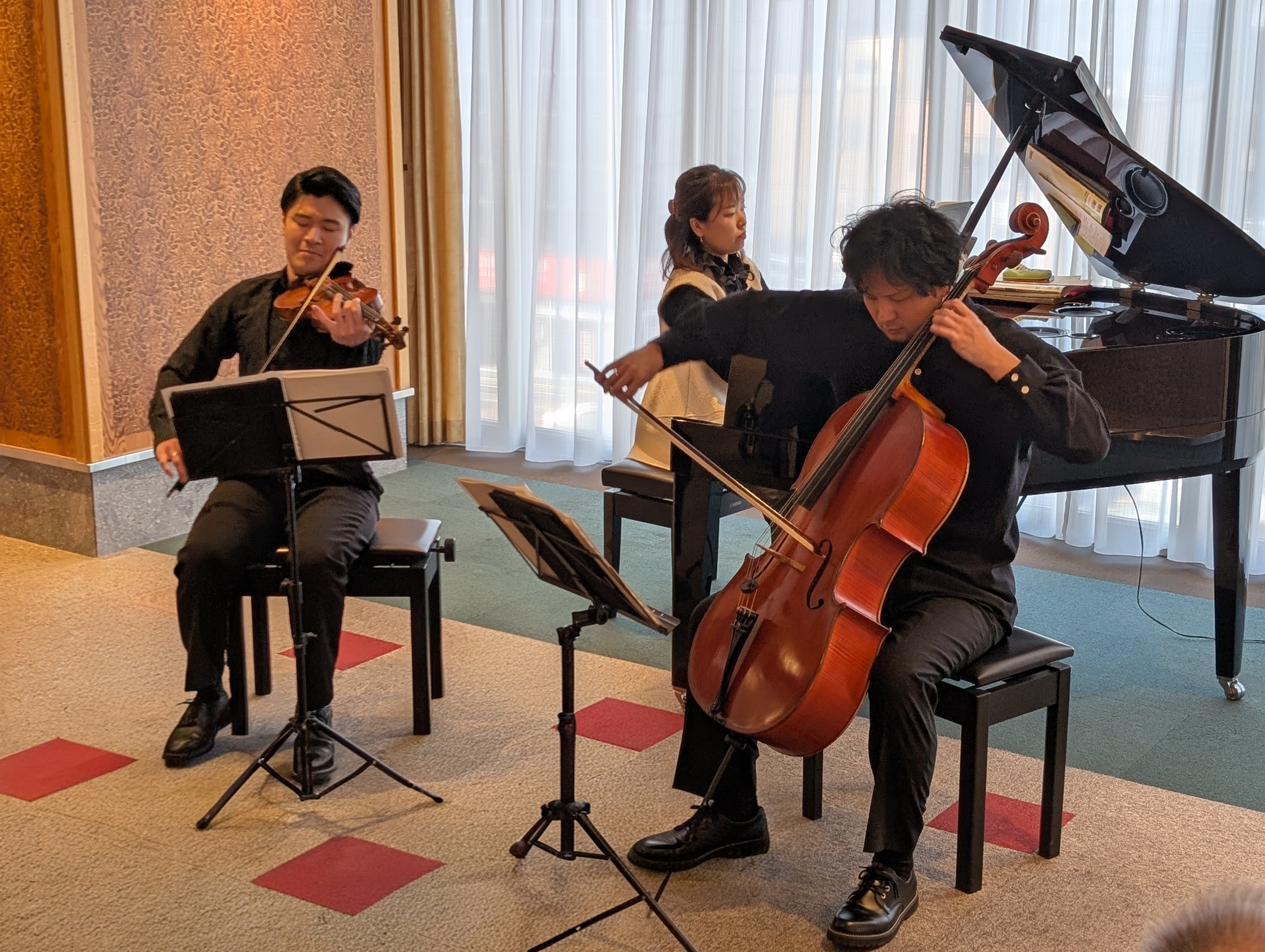 1月30日(金)、SJRの定期演奏会「ニューイヤーコンサート2026」を開催しました。サブタイトルに”華麗なる新年の調べ”と題し、ゲストにピアノ古賀美代子さん、チェロ宇野健太さん、ヴァイオリンは九州交響楽団第二ヴァイオリン首席奏者の山下大樹さんの3名をお迎えし開催しました。クライスラー作曲「美しきロスマリン」、フォーレ作曲「子守唄」、グリエール作曲「ヴァイオリンとチェロのための小品より」などのクラシックの定番曲を中心に、「サウンドオブミュージックメドレー」などを織り交ぜて演奏いただきました。そして最後はニューイヤーコンサートと言えばこの曲、ヨハンシュトラウス2世作曲「美しく青きドナウ」を演奏いただきました。当日は70名を超える大変多くの方にご参加いただき空席がゼロに。あっという間の1時間が過ぎて行きました。終了後ご参加の皆さまからは「本格的な演奏がこんな間近で聴けて嬉しかった」、「良い音でした」などのお声をいただきました。ご参加いただいた皆さまありがとうございました。次回の定期演奏会(スプリングコンサート)は3月27日(金)に開催予定です。お楽しみに!