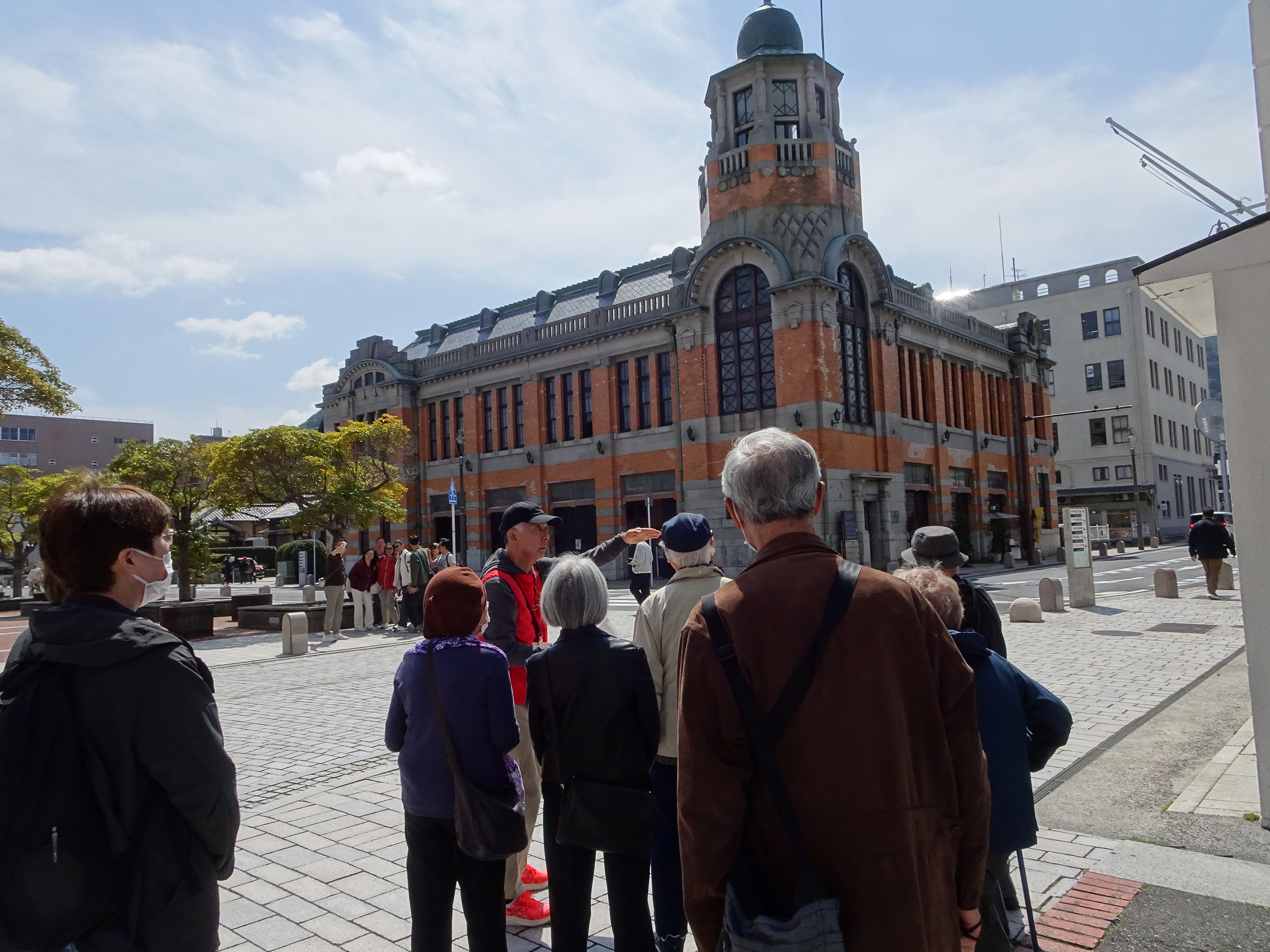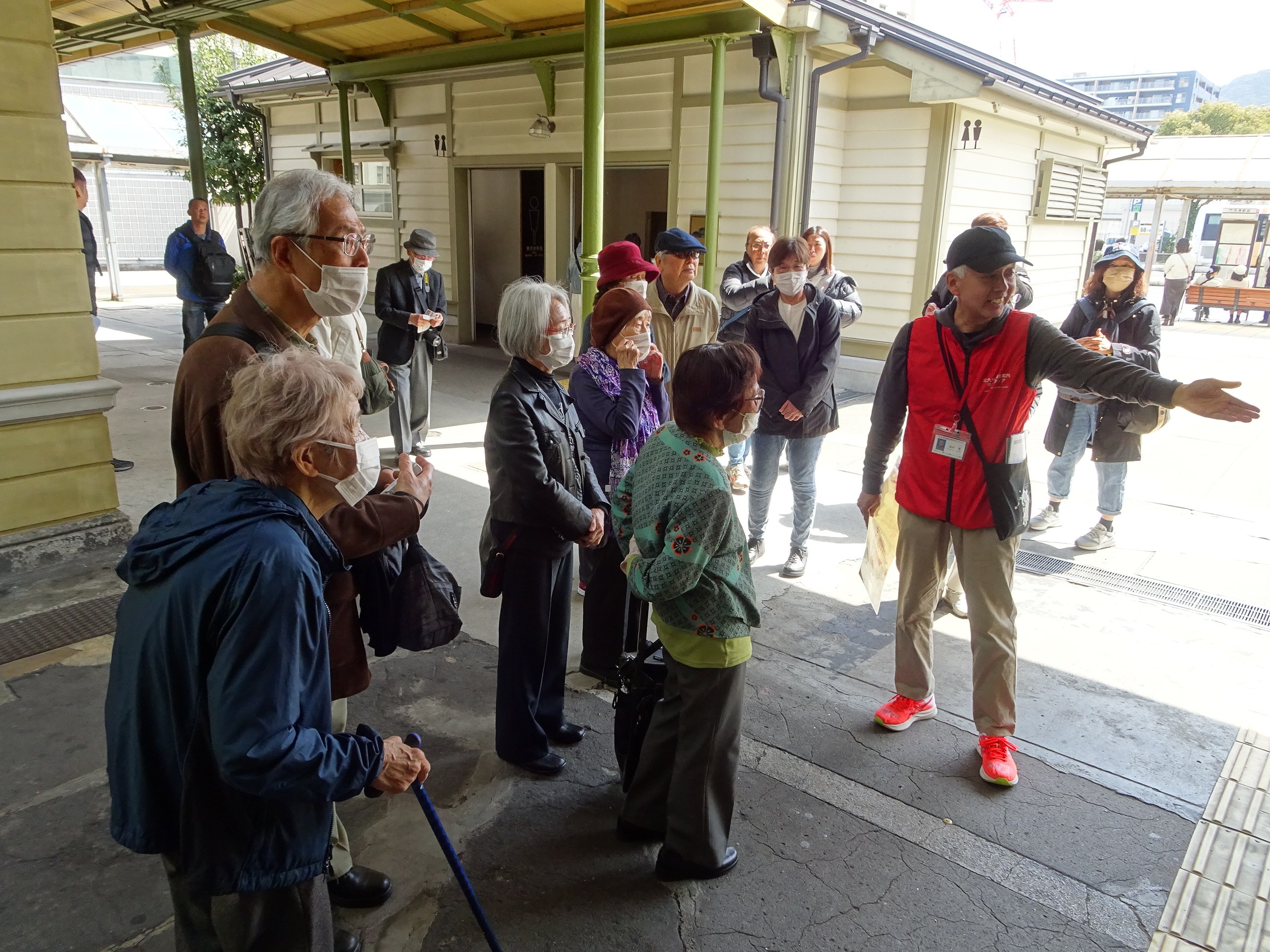 3月26日(木)、日帰りグルメに行って来ました。今回の行先は北九州「門司港レトロめぐり」です。ご参加者と付添いの職員13名にてSJRを9時にマイクロバスにて出発、今回は(公財)北九州観光コンベンション協会のボランティアガイドさんにご協力をいただいての開催となりました。ガイドさんと現地にて合流後まず向かったのは国指定重要文化財の「門司港駅」。門司港駅は2013年から約6年の歳月をかけて改修工事を行い大正時代の創建時の姿が甦った由緒ある建物です。