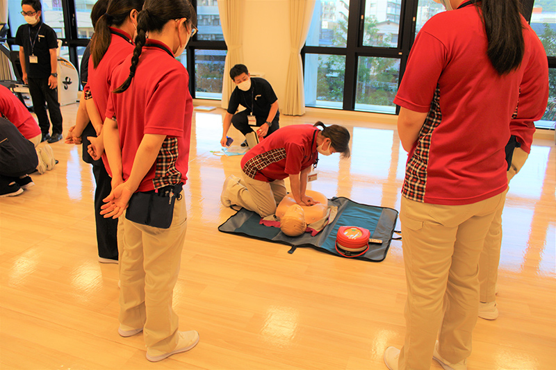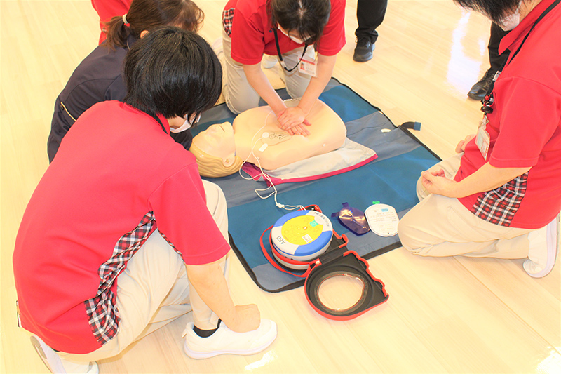 いざという時のために、AEDを使った適切な一時救命処置を学ぶ講習は、毎回、緊張感のなか全職員が熱心に取り組んでいます。